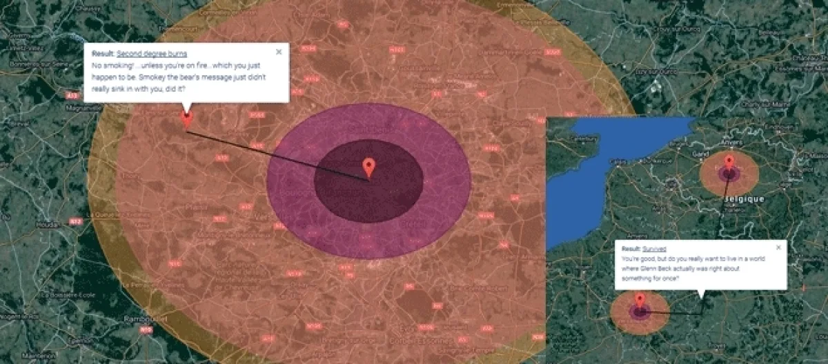 Britton Matthews, un graphiste et développeur de Seattle (Washington State), ne manque pas d’humour. Il a créé une carte interactive qui vous permet de visualiser le champ d’impact d’une bombe Nucléaire (plusieurs choix de bombes possibles) et ce qu’il advient de vous en divers endroits de la surface détruite ou touchée par le souffle de l’explosion. Plusieurs types de bombes sont proposés, mais vous pouvez aussi opter pour la chute d’une météorite de (très) grande taille.
