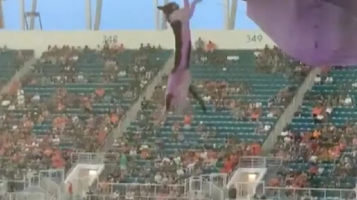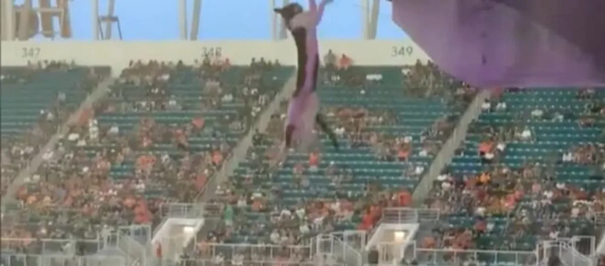 Des supporters de l'University Club of the Hurricanes de Miami, aux États-Unis, ont fait sensation en secourant un chat toujours accroché aux gradins supérieurs.