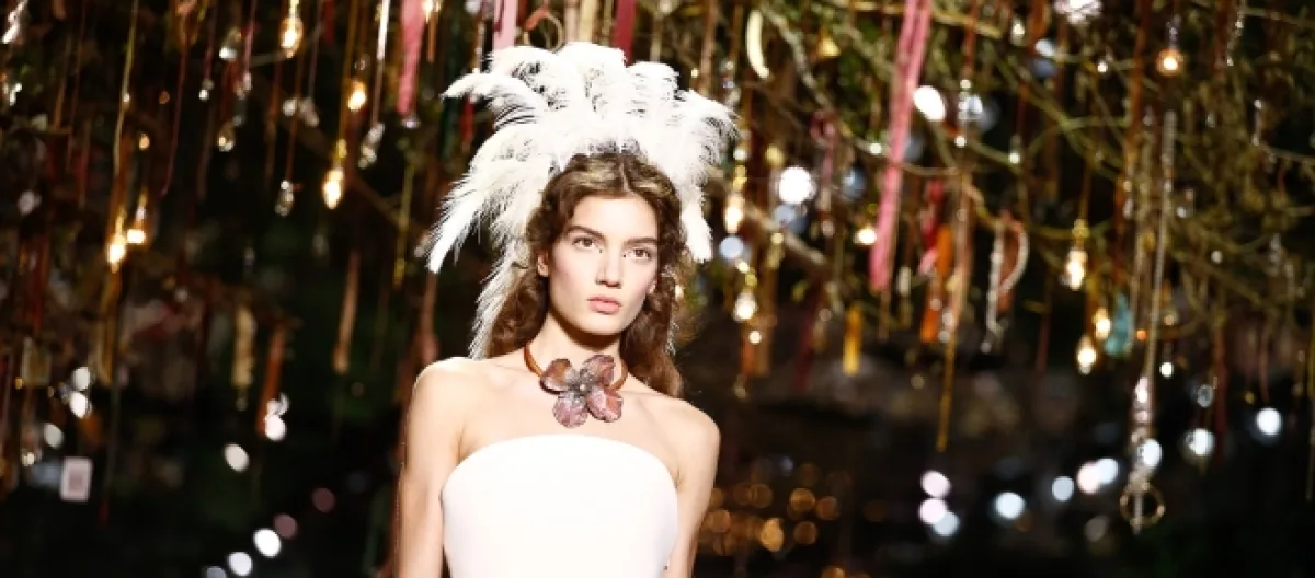 Robes de princesse, motifs des étoiles et des signes astrologiques et les fleurs si chères à Christian Dior lui-même, pour donner à nouveau leur place à des figures sombres, une capuche rajoutant la touche de mystère indispensable au défilé. Une robe de cocktail écrue à franges, brodée des fleurs, a nécessité 1.900 heures de travail. Côté beauté, des coiffes de plumes et des couronnes de fleurs ont eu une place à part dans le défilé, tandis que l’étoile, symbole éternel de la maison française, a orné presque tous les visages, créant des looks féériques ou grunge à tour de rôle.