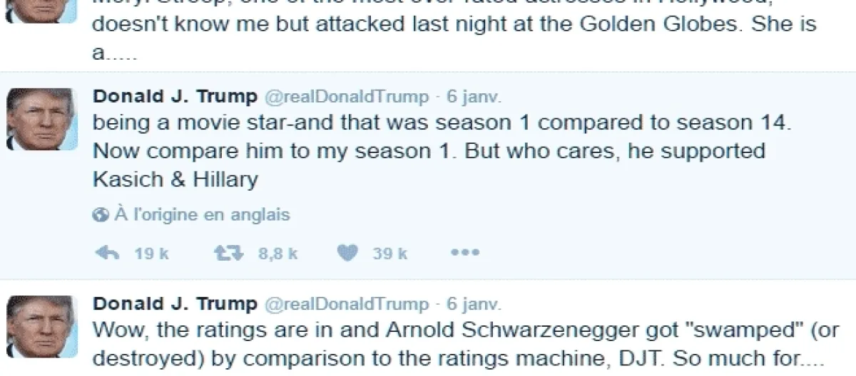 Cela ne date pas d’hier, ni de sa campagne pour les primaires républicaines, ni de celle contre Hillary Clinton, ni de la date de son élection. À quelques jours de sa prestation de serment, Donald Trump s’en prend presque chaque jour à des célébrités qui ne l’apprécient guère. Carrément pour les débiner. Derniers exemples en date, les messages visant Arnold Schwarzenegger et Meryl Streep.