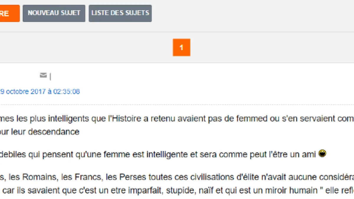 En cela, l’on peut comprendre – sans pour autant cautionner - la haine que voue une part du forum à l’endroit du féminisme moderne, ou à l’égard des femmes plus généralement (« toutes des p**** sauf maman » selon leur dicton).