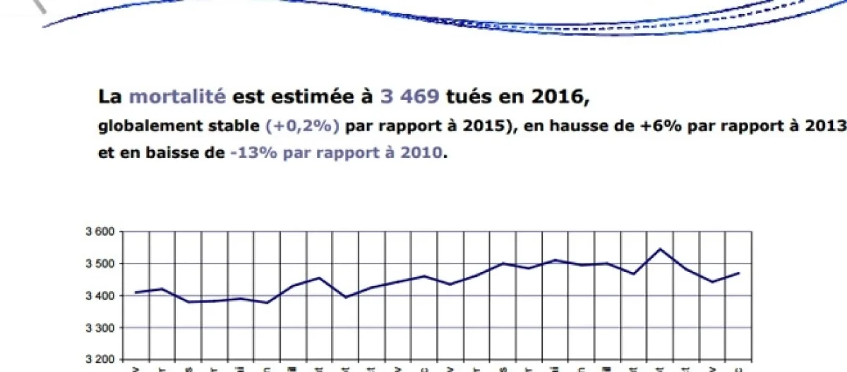 L'objectif 2015 était que le nombre des morts sur la route soit égal ou inférieur à 3 000, il a été de près de 3 500. Soit une évolution de 2,3 pts d'une année sur l'autre. Pour 2016, l'objectif était logiquement plus ambitieux (la courbe étant censée décroître jusqu'à 2 000 morts en 2020), du moins dans l'hexagone — l'échec est encore plus flagrant en Outre-mer. Le bilan publié, annoncé ''provisoire'' (les morts sont comptabilisés un mois après les accidents pour tenir compte des blessés graves n'ayant pu survivre), fait état d'une hausse de 0,2%, du fait de huit décès de plus que fin 2015. N'imputons pas trop rapidement ces mauvais résultats ni à l'État, ni aux collectivités territoriales, ni aux constructeurs automobiles, ou aux conditions de travail des professionnels de la route, ni même aux conductrices et conducteurs eux-mêmes.