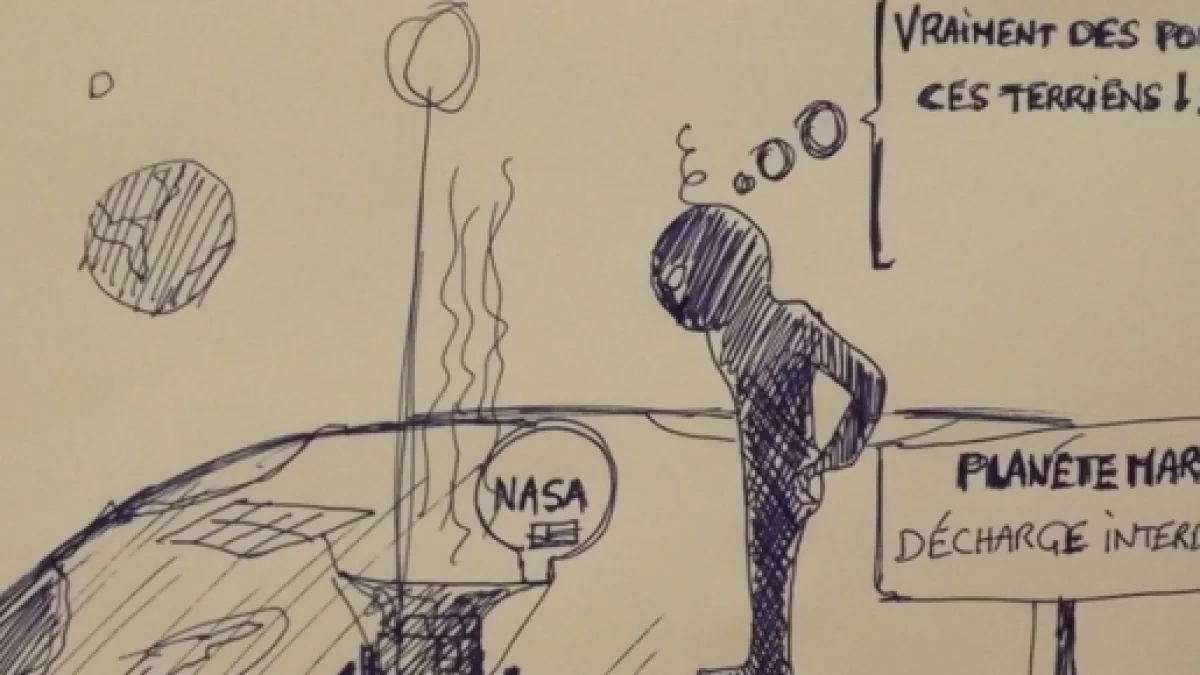 Quel message ! Les humains sont des pros, des êtres fantastiques, capables de polluer les lieux les plus éloignés de la Terre sans y poser un pied. Pour preuve cet ultime marque de passage et sur Mars, s'il vous plait ! Et vlan ! Encore une décharge polluante. Pas de chance l'espace ! les terriens auront ta peau ! Un véhicule abandonné sur le sol rouge et même pas sujet à la fourrière.