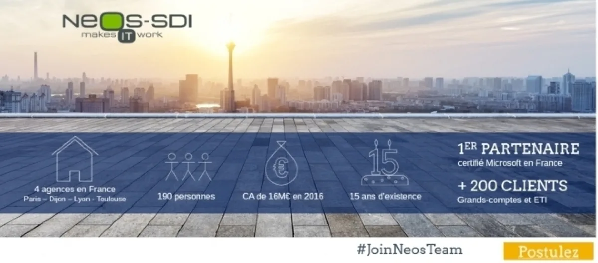 Pour cette année 2017, et conformément à sa stratégie de développement, Neos-SDI compte recruter 60 nouveaux membres. La recherche des profils est variée et spécialisée afin d'apporter des réponses adaptées aux défis de ses clients. Elle recrute aussi bien des consultants avec des compétences Cloud, Azure, BI et Big Data ou CRM; mais aussi des consultants Sharepoint ; ou encore des ingénieurs et des chefs de projets .net, pour renforcer ses équipes intervenant chez ses clients ou depuis son centre de services de Dijon. Elle continue par ailleurs de renforcer ses équipes support et d'encadrement à travers, notamment, le recrutement d'ingénieurs d'affaires.