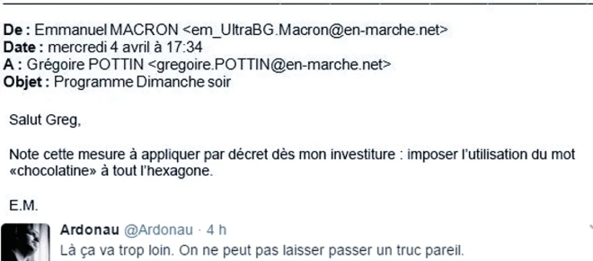 Parlons des MacronLeaks. En nous conformant bien sûr aux recommandations de la Commission de contrôle de la campagne électorale, soit en nous abstenant totalement d'en diffuser la teneur. D'une part parce qu'il est très aisé à tout un chacun d'accéder à des sites divulguant des fac-similés de ces documents (la preuve : le visuel ci-dessus en provient, et puisqu'il s'agit d'un faux, manifestement ironique, je n'enfreins strictement rien).