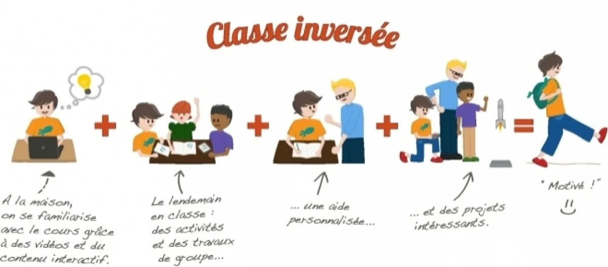 La classe inversée est un concept venu d’Amérique du Nord qui a pour objectif de dynamiser le temps passé sur les bancs de l’école. Les cours sont proposés en dehors du temps scolaire via les TIC (vidéos sur internet notamment), tandis que le temps de classe est réservé à l’accompagnement des élèves dans leurs apprentissages. Pendant ce dernier, on se consacre aux travaux pratiques et aux résolutions de problèmes complexes en privilégiant le travail de groupe qui favorise la collaboration.