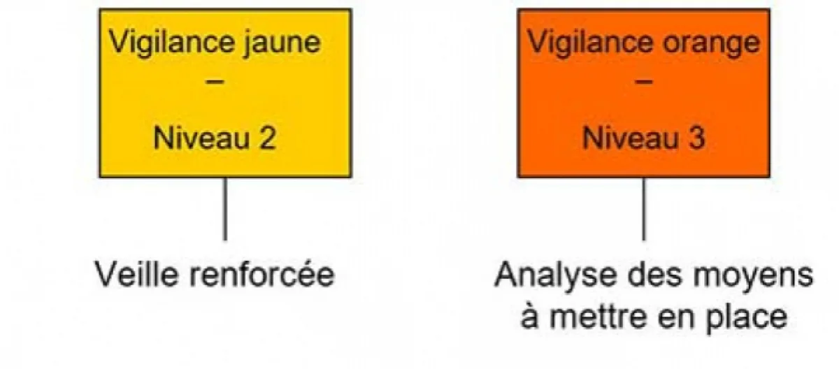 Le niveau 1 - de surveillance - est enclenché automatiquement chaque année le 1er Juin et perdure jusqu'au 31 Août, alors que le niveau 2 représente un "avertissement chaleur" adressé aux Français et aux préfets de certains départements. Ce jeudi 26 Juillet 2018, les 18 départements concernés par la vigilance de Météo France ont été placés en niveau 3 du PNC, qui sous-entend la possibilité immédiate de déclencher plusieurs plans au niveau local : le plan Blanc pour maximiser la présence de personnel et de moyens dans les hôpitaux, le plan Orsec pour mobiliser les services de secours, et le plan Vermeil pour venir en aide aux personnes les plus vulnérables.