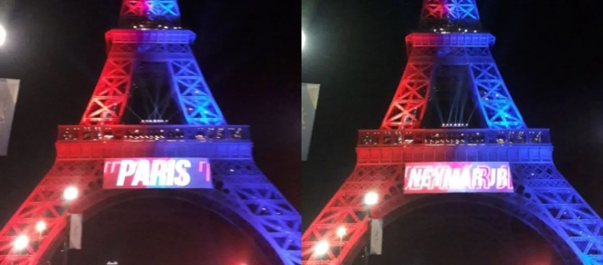 Samedi soir, la Tour Eiffel a été évacuée vers 00h30 en raison de l'interpellation d'un terroriste présumé près du monument parisien. Quelques heures plus tôt, elle s'illuminait aux couleurs de l'équipe du Paris Saint-Germain et souhaitait la bienvenue à la nouvelle recrue du club, Neymar Jr. Le nom du joueur s'est affiché sur les écrans au premier étage de la tour qui avait pour fond le rouge et le bleu, les couleurs du PSG.