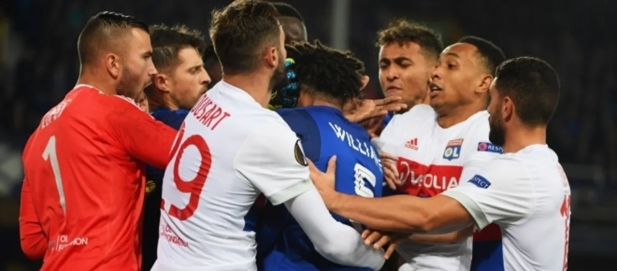 Par ailleurs, une bagarre générale a éclaté une vingtaine de minutes après le début de la deuxième mi-temps de la partie, alors que Lyon menait 1-0. L'échauffourée a débuté après une charge lourde d'Ashley Williams, le capitaine d'Everton, sur Anthony Lopes, le gardien de l'OL. Elle a ensuite dégénéré et a impliqué plusieurs joueurs de chaque équipe. Avant que des supporters de l'équipe anglaise viennent s'en mêler depuis les tribunes et distribuent des coups aux Lyonnais.