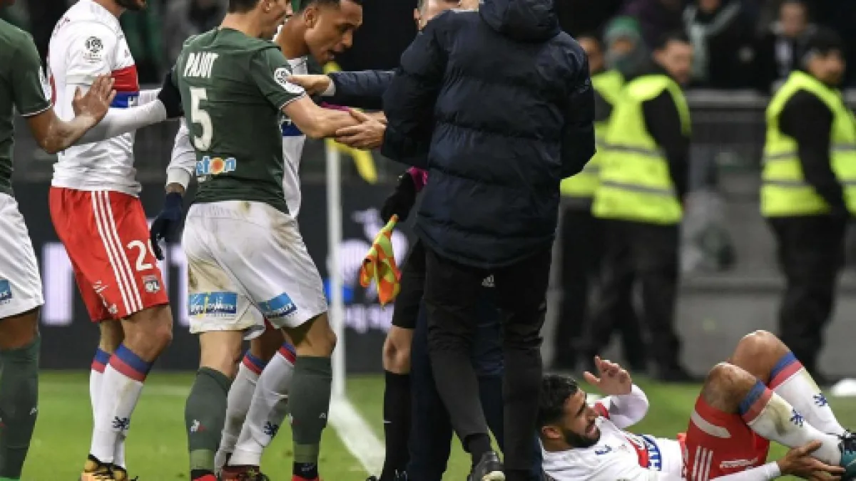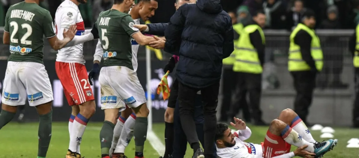 Nabil Fekir vient de marquer le cinquième but lyonnais, son deuxième but personnel. Il se dirige ensuite vers la tribune sud du Chaudron et enlève son maillot en montrant son nom aux supporters stéphanois. Excédés par cette provocation, les Ultras de l’ASSE décidèrent d’envahir le terrain afin d’en découdre avec les joueurs lyonnais. Immédiatement évacués, les joueurs lyonnais ont pu quitter le terrain sans encombre. Le match a été interrompu pendant une quarantaine de minutes. Rappelons qu’en début de match des fumigènes ont perturbé la rencontre.