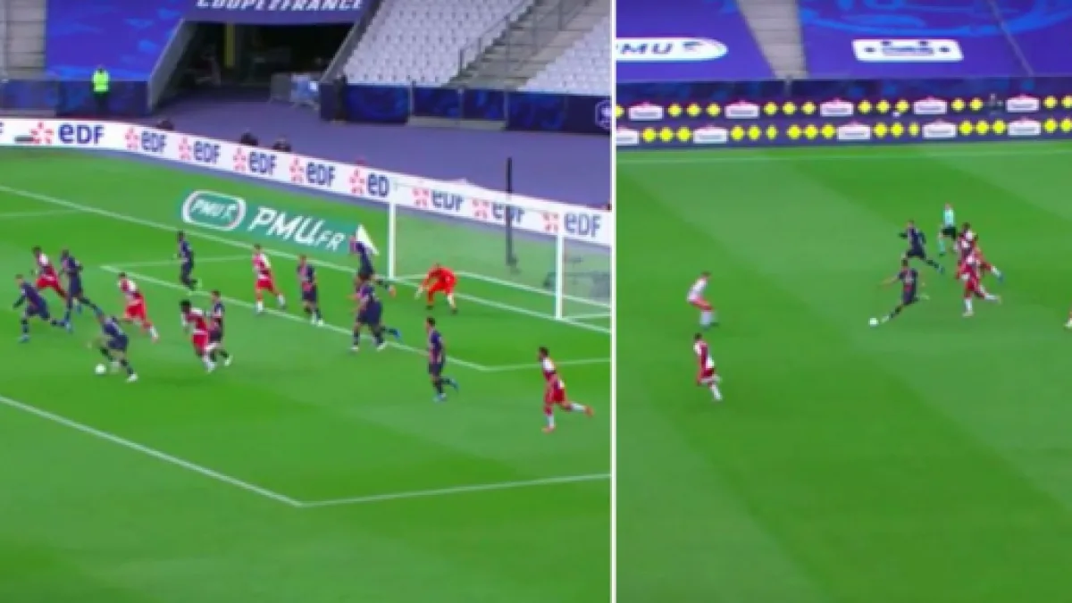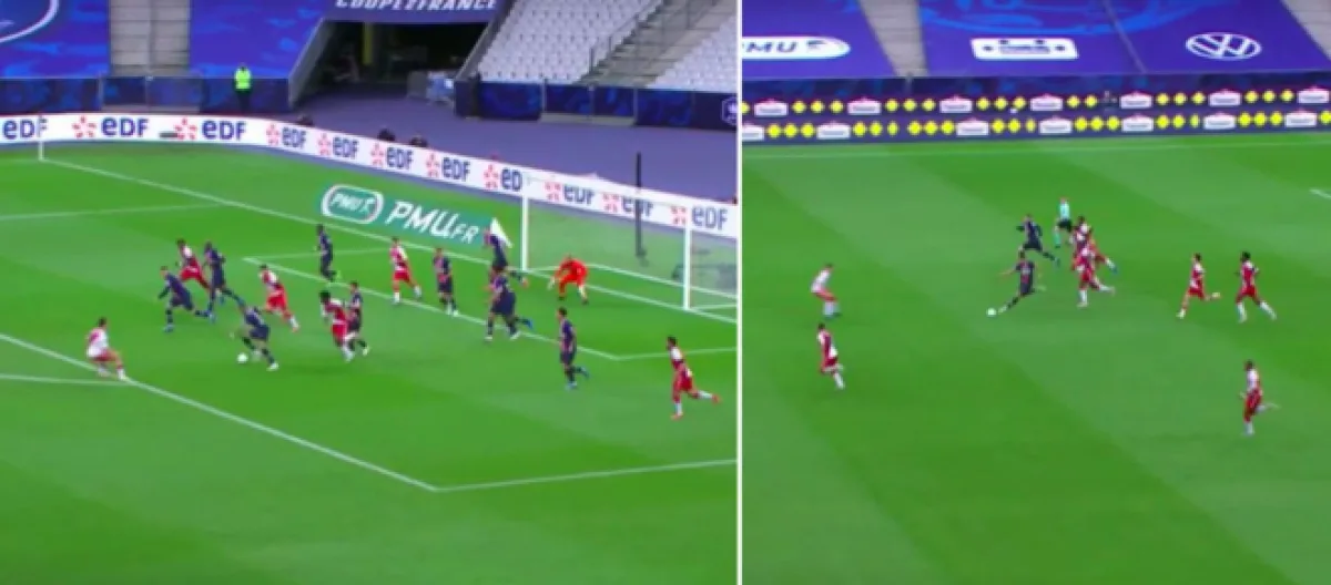 En l'absence de Neymar (suspendu) et Marco Verratti (blessé), Kylian Mbappé a encore une fois pris ses responsabilités. Dès la 19ᵉ minute après une énorme erreur d'Axel Disasi, l'international français récupère le ballon et fait une passe en retrait pour Mauro Icardi. Ensuite, il a continué à dérouler avec un lob astucieux qui ressemble au but d'Edinson Cavani inscrit il y a quelques jours mais qui va s'écraser sur le barre. En véritable organisateur du jeu, il a réalisé une action de grande classe en remontant tout le terrain, tout seul.
