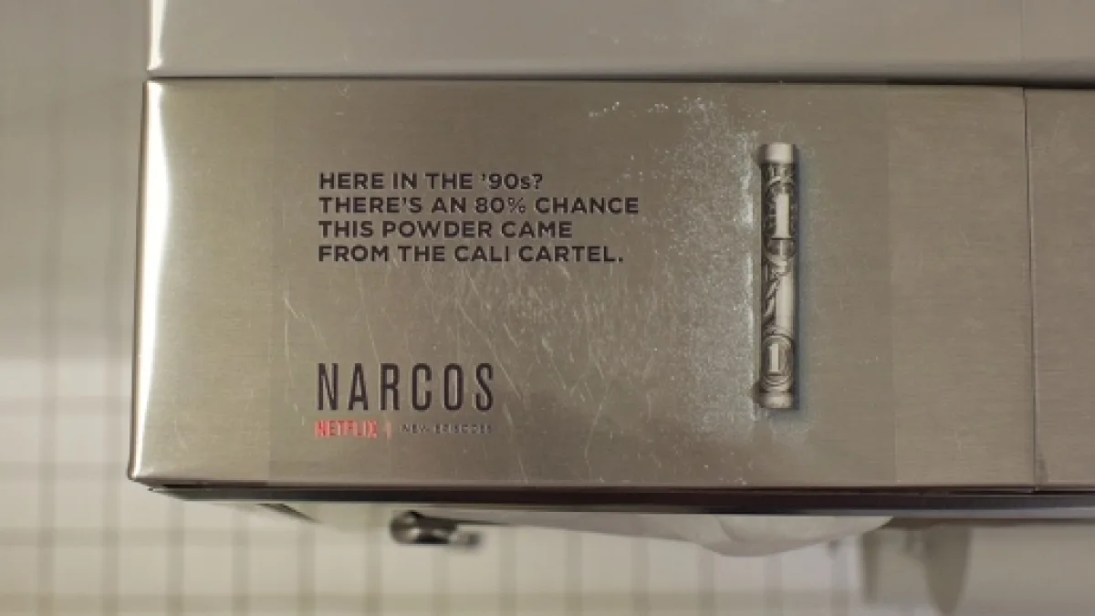Sur les urinoirs, nous pouvions lire sur les stickers promotionnels : “Vous étiez ici dans les années 90 ? Il y a 80% de chances que cette cocaïne provienne du Cartel de Cali“. Avec à côté, une image avec de la poudre blanche et un billet de 1$.